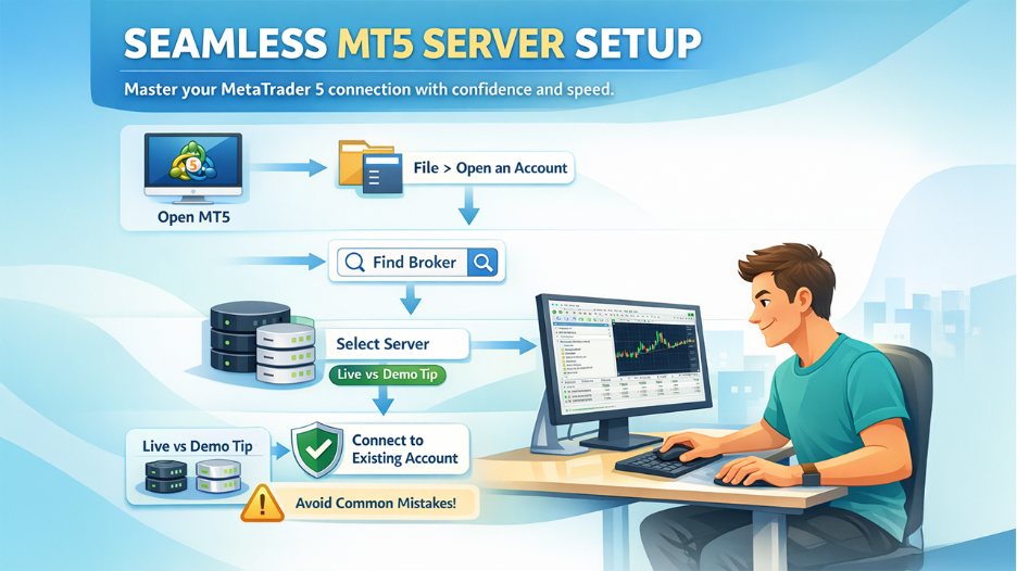 Adding a server in MT5 is a five-minute task once you’ve done it correctly. The most important thing is having the correct server name from your broker — that single piece of information is what makes the difference between a successful connection and a frustrating loop of error messages.